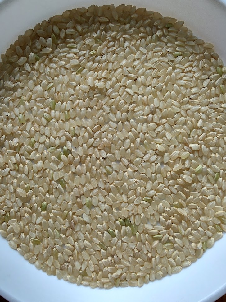 玄米の画像2025/10/撮影、多少は、高温障害の影響を受けて白い部分がありますが、前年産よりは綺麗に仕上がりました